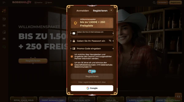 Ein Profil bei RodeoSlot zu erstellen ist einfach, und Sie können – wo verfügbar – zuerst im Demo-Modus starten, bevor Sie einzahlen. Um ein RodeoSlot Konto in unserem RodeoSlot Online-Casino zu eröffnen, folgen Sie den Schritten unten und halten Sie Ihre persönlichen Daten konsistent mit Ihrer Zahlungsmethode. Nach der Registrierung können in Ihrem Profil Aktionen beworben werden, aber ein Bonus ohne Einzahlung nach der Registrierung ist nicht garantiert und erscheint nur, wenn er aktiv ist. Wenn Sie gezielt nach einem RodeoSlot Casino Bonus ohne Einzahlung suchen, prüfen Sie immer die Promotions-Seite auf aktuelle Verfügbarkeit und Bedingungen.